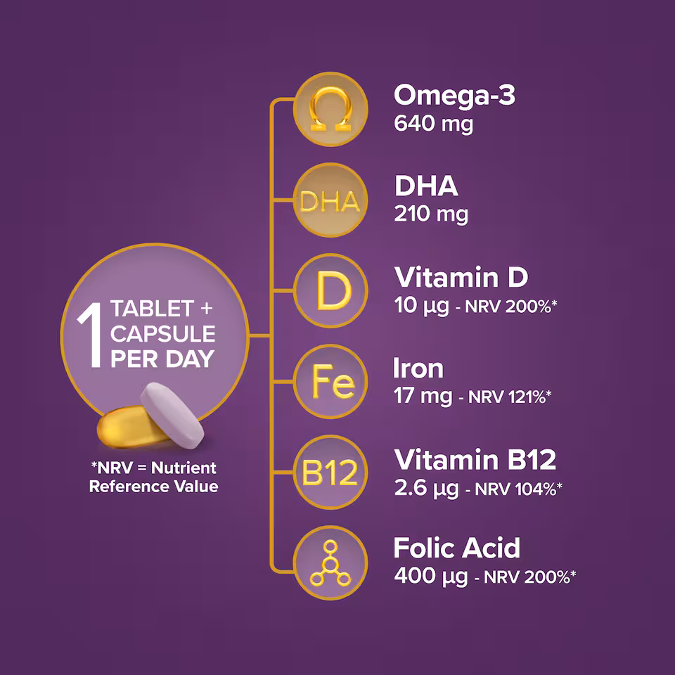 Potassium Chloride, Calciun Carbonate Prep. (Calcium Carbonate, Maltodextrin), Magnesium Oxide, Microcrystalline Cellulose, Tablet Coat (Hydroxypropylmethyl Cellulose; Colours: Titamium Dioxide, Anthocyanins, Shellac, Talc; Acidity Regulator: Citric Acid), Vitamin C Prep. (Ascorbic Acid, Hydroxypropylmethyl Cellulose), Ferrous Fumarate, Vitamin E Prep. (Dl Alpha Tocopheryl Acetate, Silicon Dioxide), Hydroxypropyl Cellulose, Stearic Acid, Niacinamide, Silicon Dioxide, Zinc Oxide, Sodium Selenite Prep. (Calcium Carbonate, Sodium Selenite), Magnesium Stearate, Calcium Pantothenate, Crosslinked Sodium Carboxy Methyl Cellulose, Manganese Sulphate, Beta Carotene Prep. (Modified Starch, Beta Carotene, Corn Starch, Sucrose, DL Alpha Tocopherol, Ascorbyl Palmitate), Vitamin D Prep. (Maltodextrin, Ethylcellulose, Mixed Tocopherols, Cholecalciferol), Vitamin B12 Prep. (Mannitol, Cyanocobalamin), Pyridoxine Hydrochloride, Copper Sulphate, Thiamin, Riboflavin, Ginger Extract (Zingiber Officinale Root Extract, Modified Starch, Silica), Vitamin K Prep. (Acacia, Phytomenadione), Folic Acid, Potassium Iodide, Biotin. Omega 3 Capsule: Fish Oil Concentrate, Capsule Shell (Gelatine, Glycerol)