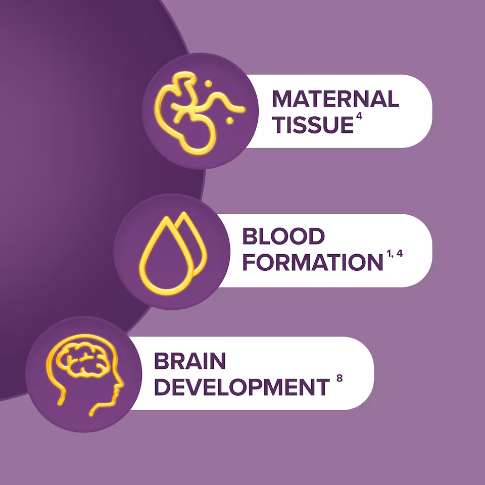 • Contains Omega-3 DHA to support the development of your baby’s brain and vision⁸, Vitamin C to support the immune system⁷, Vitamin B12 & Iron contributing to the reduction of tiredness andfatigue³,⁵